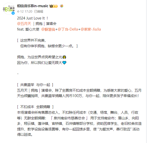 早在本年4月中旬,五月上帝唱阿信就曾在微博上文告了泉州站演唱会。服气音乐还示意:“本场演唱会整个售票总收入,不扣除任何老本,无酬全额捐赠。”